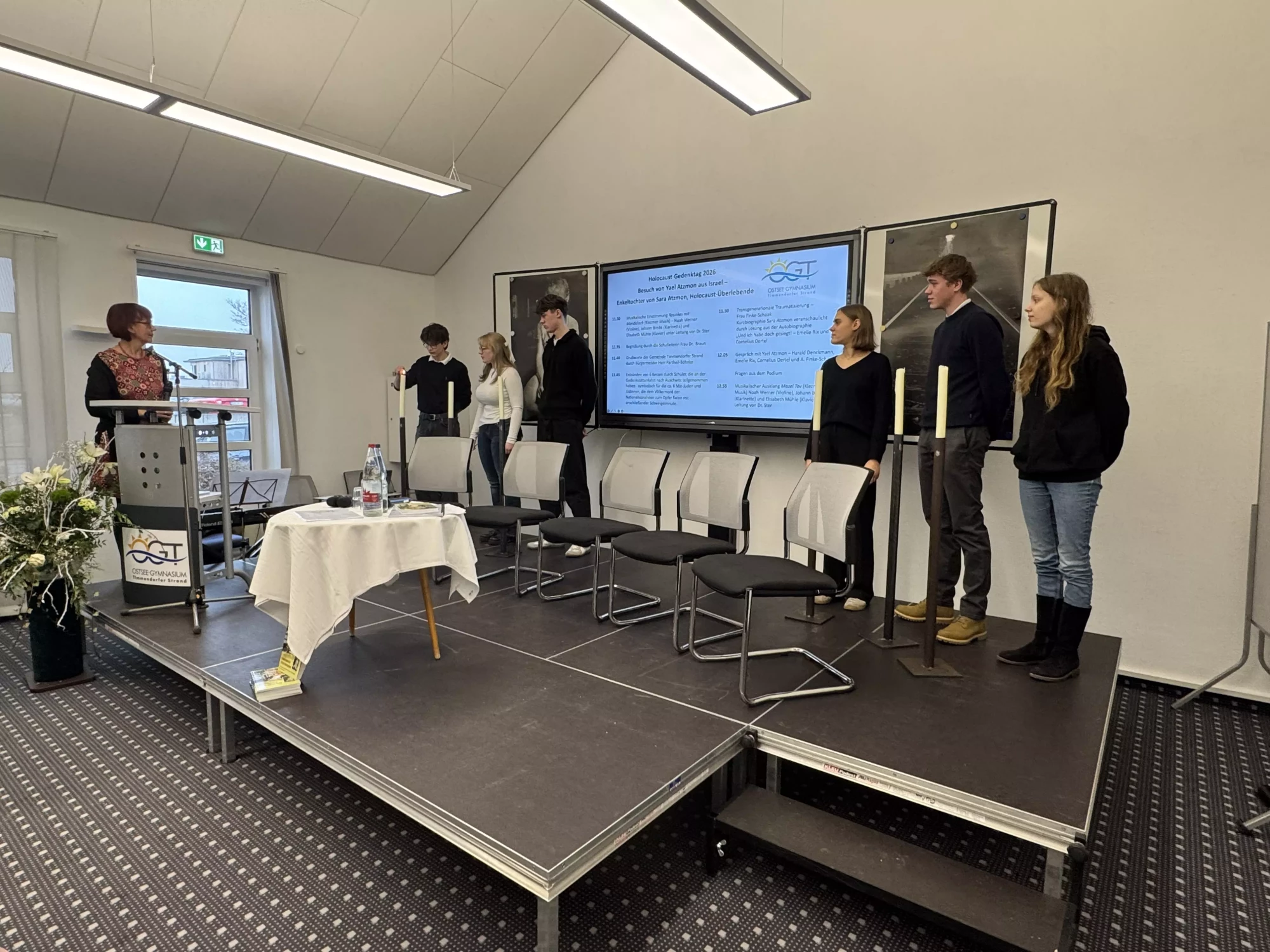 In Gedenken an die sechs Millionen ermordeten Jüdinnen und Juden, zündeten sechs Jugendliche, die im Oktober 2025 an der Gedenkstättenfahrt nach Auschwitz teilgenommen hatten, sechs Kerzen an. Wir erhoben uns zu einer Schweigeminute und gedachten der Opfer.
