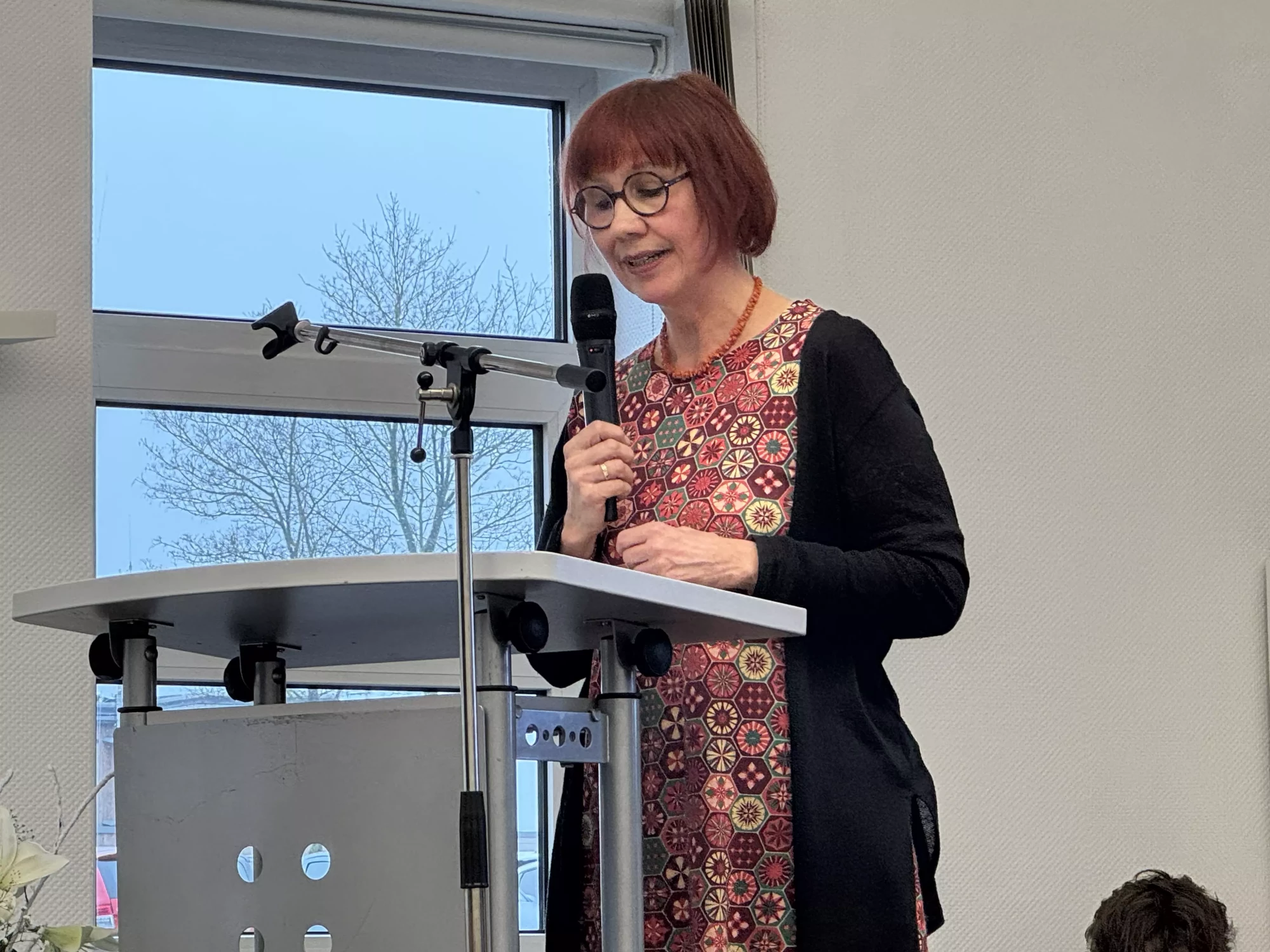 Frau Finke Schaak, die Organisatorin der Veranstaltung und Koordinatorin der Erinnerungsarbeit an unserer Schule, erläuterte in ihrer Rede das Phänomen der transgenerationalen Traumatisierung, denn unverarbeitete traumatische Erfahrungen von Holocaust-Überlebenden werden häufig unbewusst weitergegeben an deren Kinder und Enkelkinder, was sich dann häufig in Symptomen wie Angst Depressionen oder auch psychosomatische Beschwerden äußert.